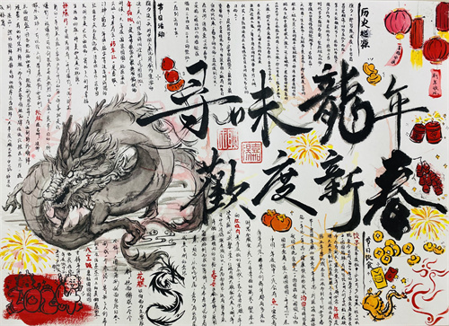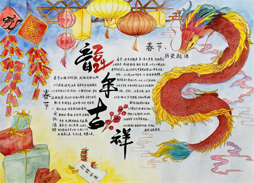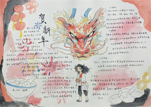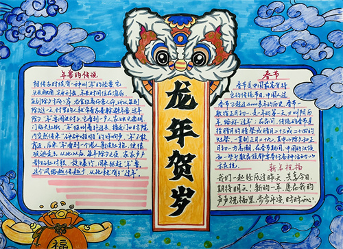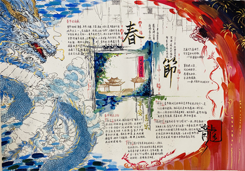 寻味“龙”年,首先是寻味“龙”根,学生们结合了解的春节来历和风俗,围绕“中国龙”元素,通过手绘小报积极表现中国文化的博大精深,深情表达对“龙”年到来的期待——希望新的一年如所画之龙一样腾飞万里。