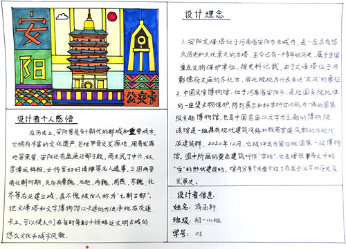 七年级的同学们在历史课堂学习的基础上,向课外拓展,自主深入了解历史文化名城的历史建筑遗迹、文物遗迹、历史沿革、著名历史人物等相关知识,做了充足的功课。同学们根据自己的理解,大胆进行创新设计,为历史文化名城绘制独具特色的文创公交卡图样手稿,我们一起来看看同学们的精彩作品吧!