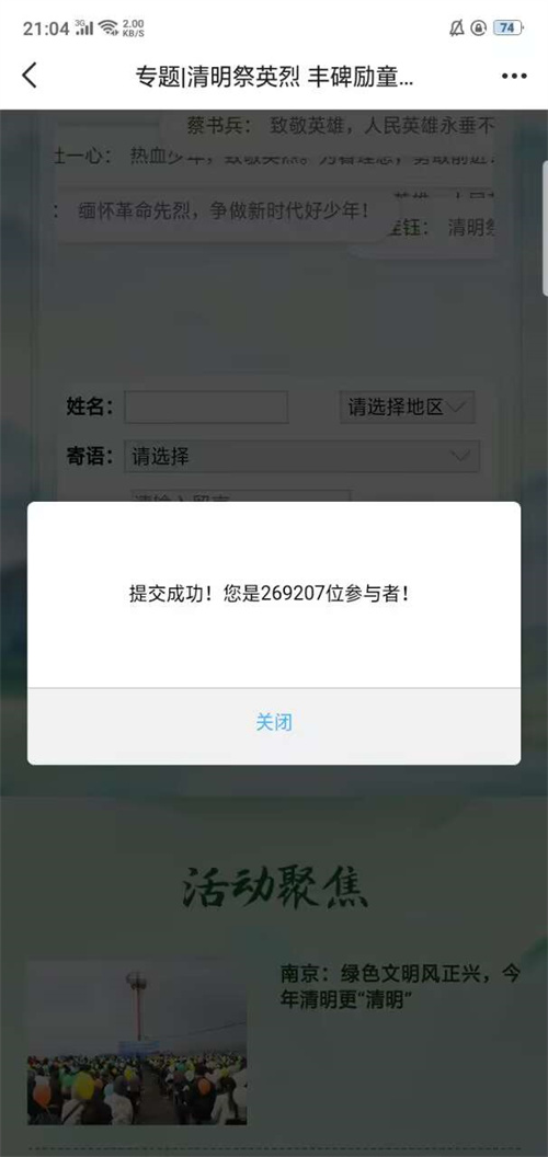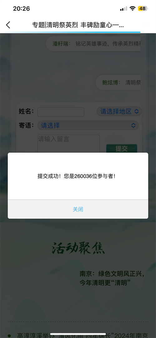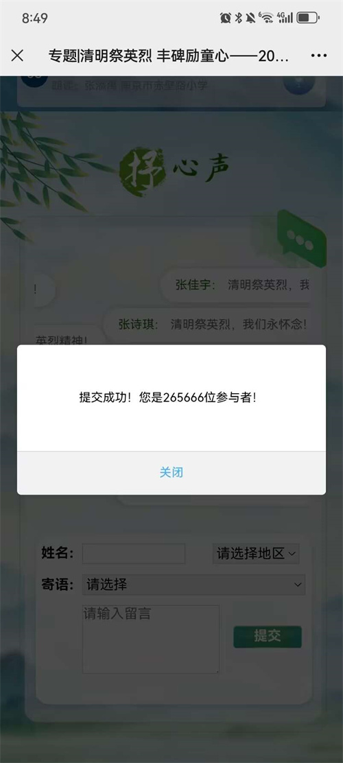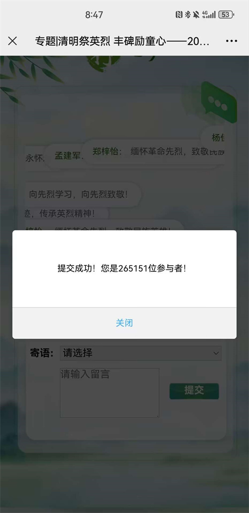 网上云端鞠躬、献花、留言,通过“网上祭英烈”互动平台,表达对先烈、先人、先贤、英雄的感恩和敬仰之情。引导学生表达对先烈的敬意和哀思,进一步增进对烈士英雄事迹的了解和感悟。